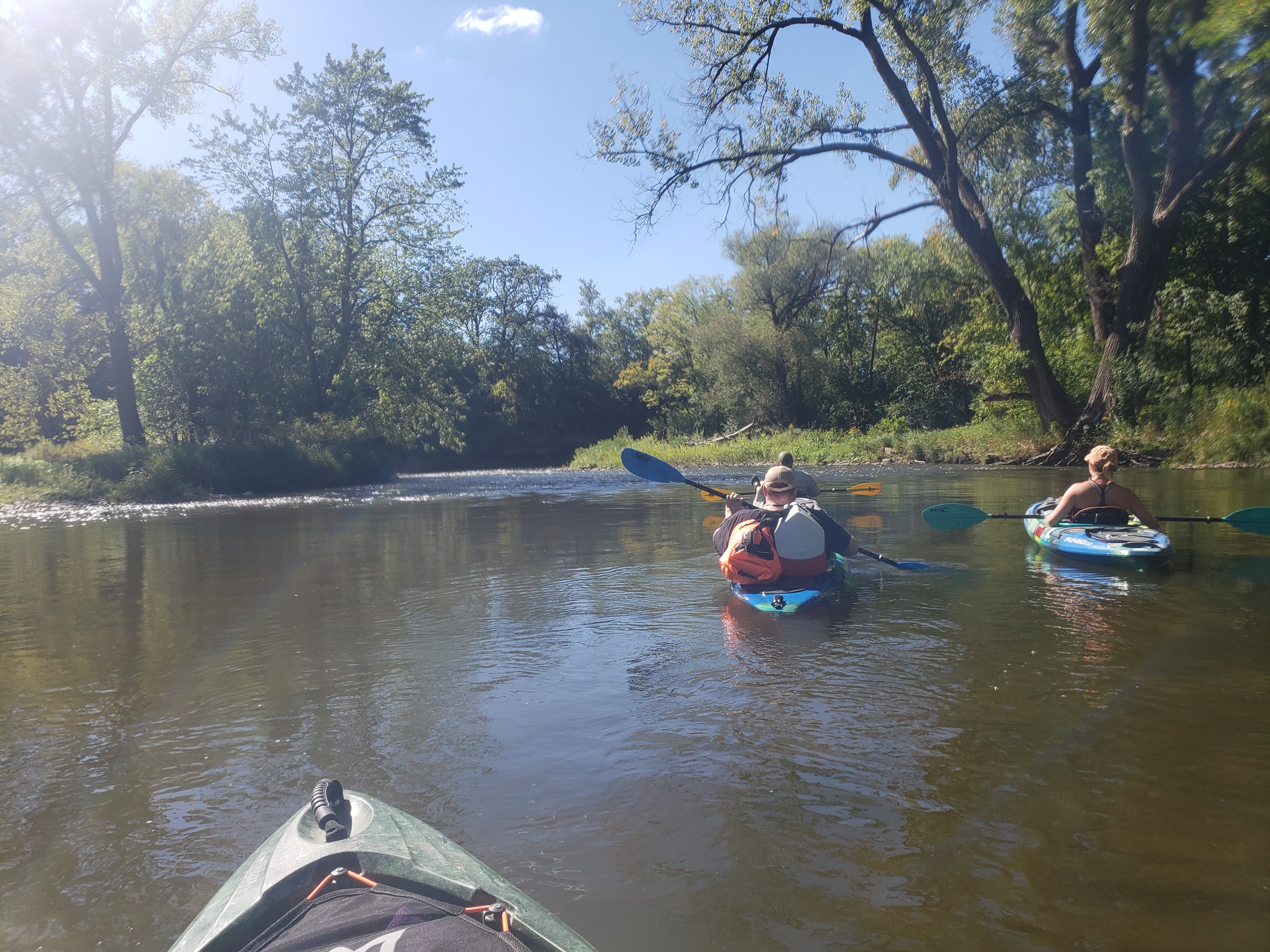 20220905 Second annual Paddle to Death. Overnight trip with 28 miles of paddling. Put in at Krogh's Landing on the Straight River and got out of the Cannon River at Riverside Park in Northfield. Water levels were low to medium. The Straight River presented us with lots of rocks, some snags and sections of fast flowing water. The challenge was to avoid the shallow areas where the kayaks would scrape, and the rocks in the riffle patches where the elevation dropped. The rocks could easy catch a kayak, turn it sideways and tip it, allowing water to flow in. The Cannon was a bit of an easier ride. The water levels were higher, and the biggest safety risk was downed trees with branches submerged just below the water. The water was slowly moving so it was reasonable to avoid the obvious snags but the paths the looked clear had hidden dangers just below the surface. Like the rocks in the riffle patches, they could catch a kayak and turn and tip it leading to a capsize. We enjoyed forested view with beautiful rock walls and outcroppings and many birds. We saw many blue herons and Bald Eagles. Several of the Bald Eagles were still juveniles noted by the lack of the white head and tail. We also saw some cityscapes in Fairbault and went through a stretch of river under several bridges.